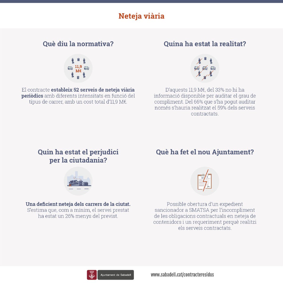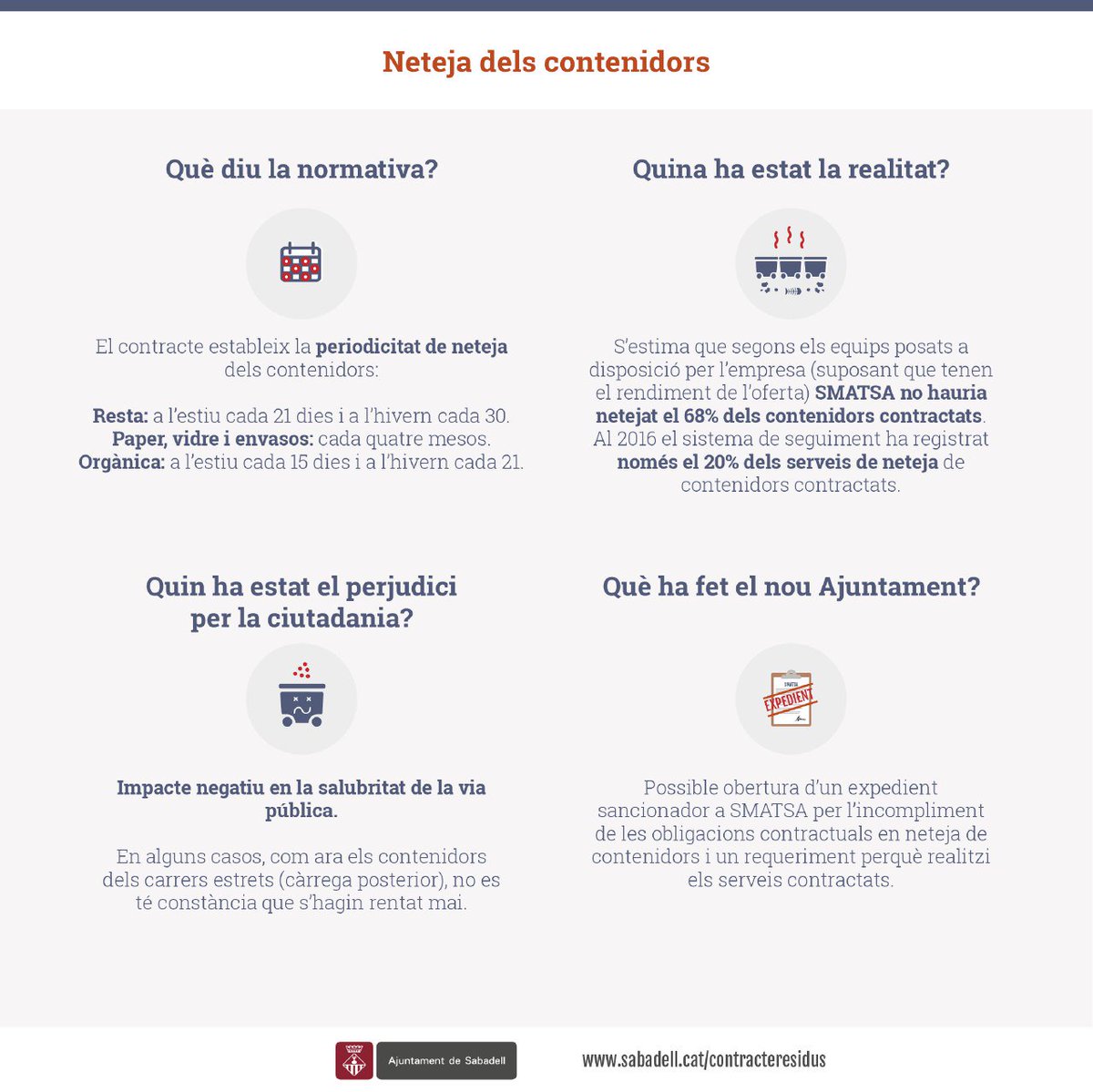 El consistori ha detectat tant facturació de més com menys serveis dels contractats, posant en dubte la viabilitat econòmica del contracte. L’Ajuntament de Sabadell ha instat a l’empresa SMATSA al total compliment del contracte de residus i neteja a la ciutat després que hagi detectat diversos incompliments en el mateix. A més, el consistori ha obert diversos expedients a l’empresa per reclamar la compensació pels imports pagats de més, exigir el compliment dels serveis contractats i per sancionar per les faltes comeses.